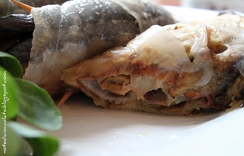 - Prendere le fette di melanzana, adagiare su ciascuna una fettina di speck, qualche listerella di formaggio, il trito di funghi e chiudere a involtino (le mie stavolta era troppo piccole da arrotolare e le ho semplicemente piegate a mezzaluna).