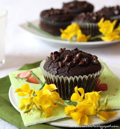 Devo ammettere che quando la scorsa settimana ho visto questa ricetta ne sono rimasta subito rapita. Un po’ per la muffin-mania, una sindrome da cui è ben difficile restare immuni, un po’ per la choco-dipendenza che anche in estate stenta ad abbandonarmi (sono una donna… mica ‘na santa! E quelle foto la dicevano lunga, moooolto lunga!), un po’ per la storia dell’acqua calda..insomma mi si son drizzate subito le antenne e non son riuscita ad abbassarle fino a che non ho messo le mani in pasta. Il brutto è che per me mettere le mani in pasta significa aspettare il week end e giuro che da martedì a sabato ho viaggiato col calendario avanti di un giorno per accelerare i tempi. Meno male che venerdì mattina c’è stata la sveglia a ricordarmi che era sempre e ancora VENERDI e mi toccava alzarmi per andare a lavoro!