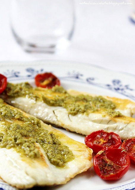 - Sistemare i filetti nei singoli piatti, napparli (ullallà come sono chic oggi!!!) con il pesto, completare con gli immancabili (ormai) pomodorini al forno e servire.