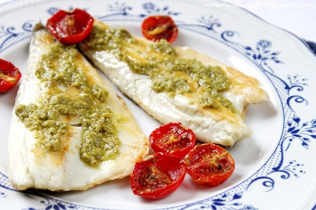 In verità chiamarla ricetta è davvero troppo; quasi mi vergogno a scriverla. Piuttosto è un’idea dell’ultimo minuto per consumare una piccola quantità di pesto avanzata dal condimento della pasta e cambiar look (ma quanto fa scena detto così?) al solito filetto di pesce passato sulla bistecchiera.